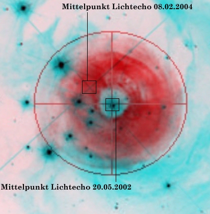 Das folgende Bild zeigt eine Bewegung des Zentrums des Lichtechos innerhalb der vergangenen zwei Jahre: