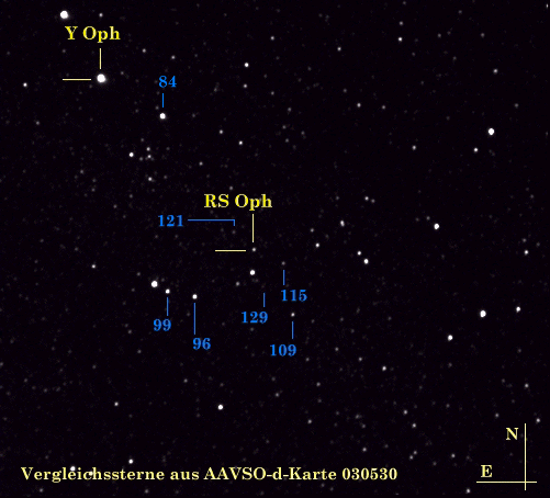 Weiter oben sind die genauen Beobachtungszeiten der Satelliten aufgeführt, auch außerhalb dieser Zeiten sind Beobachtungen erwünscht (Swift beobachtet bis in den Oktober hinein). RS Oph hatte zuletzt am 12. Februar 2006 einen hellen Ausbruch, erreicht 4.8 mag visuell und blieb dann fast 3 Monate heller als 10.5 mag. Zur Zeit befindet sich RS Oph bei etwas 11.8 - 12.0 mag. Beobachtungen werden erbeten an die AAVSO: http://www.aavso.org und auch gerne an die BAV: http://www.bav-astro.de Dietmar Bannuscher, 02.09.06 Aufsuchkarte
