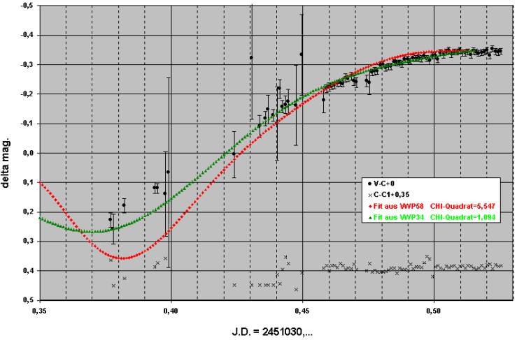 Man sieht, daß die beiden Perioden leicht voneinander abweichen. Die Differenz der Perioden ist aber lediglich 2,5 mal so groß, wie die Fehler-Summe der Periodenbestimmung. Ein größerer Unterschied der Perioden wäre ein signifikanter Hinweis auf eine langsame Apsidendrehung, die wir leider aber mit unserem Datenmaterial somit NOCH NICHT nachweisen konnten. Das müssen jetzt die nächsten Jahre (oder Jahrzehnte) ergeben.