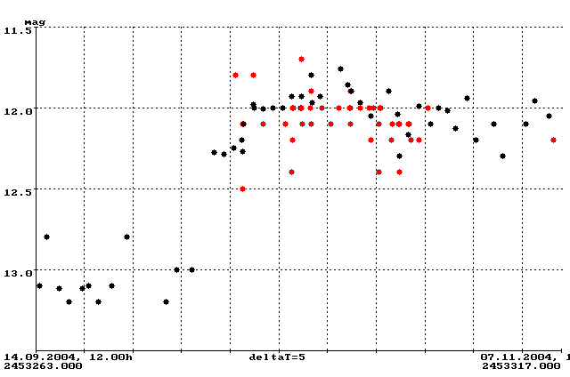 Ende September deutete sich ein Helligkeitsanstieg an, bevor die Beobachter innerhalb von zwei Tagen einen Sprung von 13.0 mag auf 12.3 mag am 2.Oktober verfolgen konnten. Nach drei Tagen stieg die Helligkeit nochmals leicht an und verweilte dann bis in den November hinein bei durchschnittlich 12.0 mag. Abbildung 2 zeigt die Lichtkurve von Beginn des Ausbruchs bis zum Redaktionsschluß in der zweiten Novemberwoche.